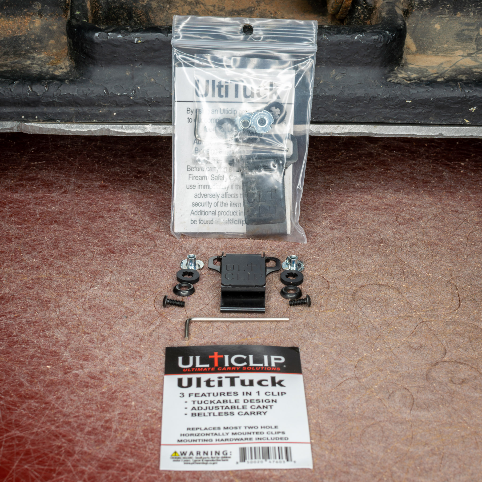 In this combo clip and hardware pack, we removed the original hardware pack that came with the UltiTuck clip and replaced it with hardware that is geared at us leatherworkers. We replaced the Chicago screws meant to be mounted to Kydex with T-nuts that can be set into a reinforcement panel. We then changed the rubber spacers so they would be sized properly for the T-nuts, and include 2 finish washers and screws to mount it all together. We even added in a 2mm hex key, so you don’t have to go digging in your toolbox or buying a new set of allen keys just to use these screws. The best part about these clips is their compatibility with the DCC MonoBlock T-nut spacing. This means you can offer your holsters with either MonoBlock clips or with UltiTuck clips, and if a customer wants a holster that has a MonoBlock on it you can swap the clip right on the spot. Also, any pattern that is compatible with the DCC MonoBlock clips is also compatible with these as well. The UltiTuck clip also supports adding cant with the T-shaped holes on either mounting point so you can get the fit that suits you or your customer best.
